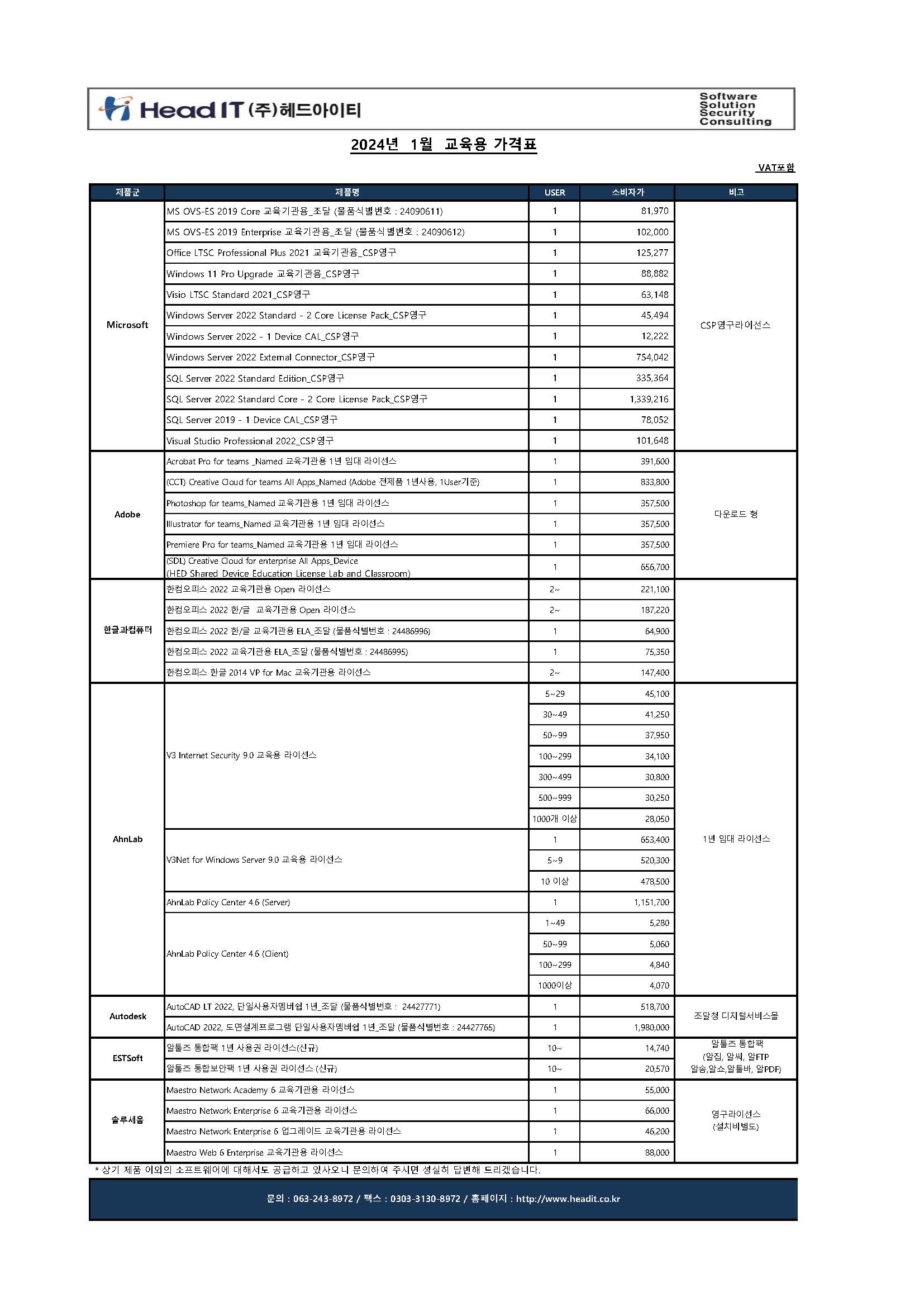 2024년 1월 교육기관용 소프트웨어 가격표를 첨부 드리오니, 많은 참조 부탁 드립니다.