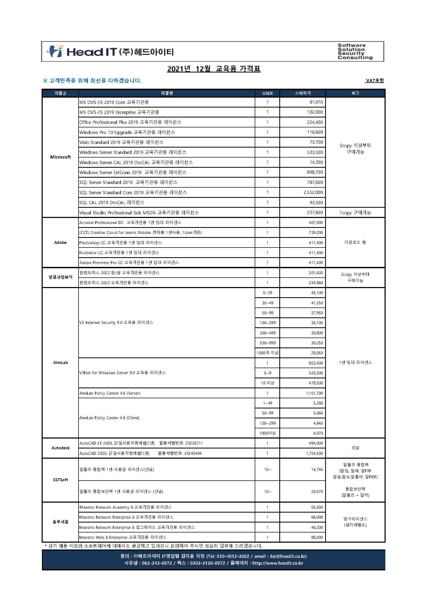 2021년 12월 교육기관용 소프트웨어 가격표를 첨부 드리오니, 많은 참조 부탁 드립니다.